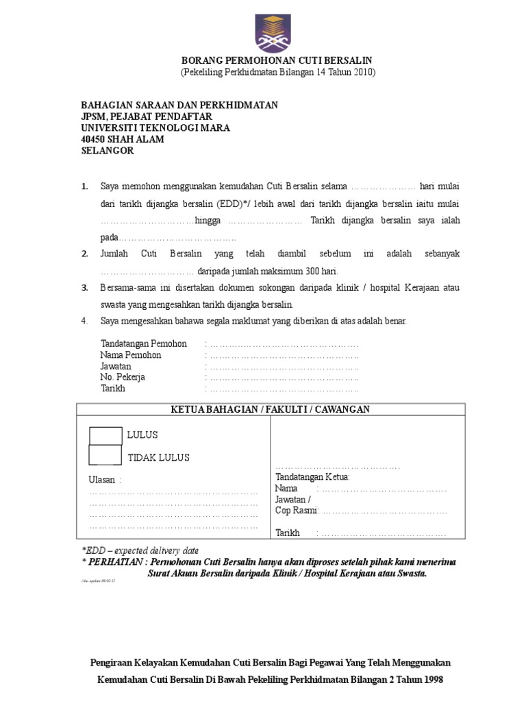 Related : Pekeliling Perkhidmatan Bilangan 14 Tahun 2010 : Pekeliling cuti bersalin bilangan 14 tahun 2010..
