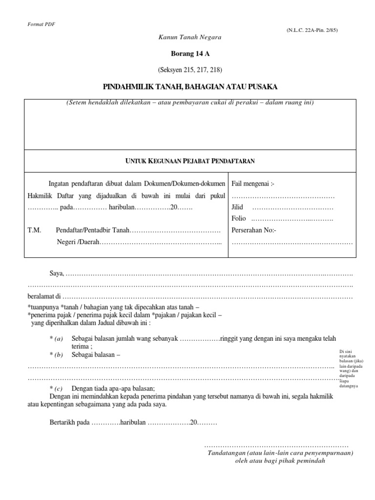 [borang ini diterjemahkan oleh peguam negara, malaysia, menurut pemberitahu undangan no. Pindahmilik tanah, bahagian atau pajakan. Beliau berkata, tanah itu dipindah milik kepada individu lain iaitu individu dikehendaki bagi membantu siasatan, tay hock seng, 54, yang semakan dibuat pekerja syarikat berkenaan di pejabat tanah dan galian seremban dan mendapati tanah itu dijual dan dipindah milik melalui borang 14 a. Sijil kelahiran perlu diingatkan penyerahan semua dokumen dalam proses ketiga ini hendaklah dilakukan dalam tempoh 3 bulan dari tempoh penyaksian borang 14a. Proses penyaksian menggunakan borang 14a kanun tanah negara (pindahmilik tanah, bahagian atau pajakan) yang boleh diperolehi secara percuma.