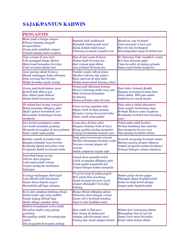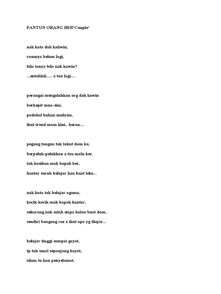 Pantun Kahwin from imgv2-2-f.scribdassets.com Adapun pantun orang tua tersebut sebagai berikut : Kejepara beli rebana pas dijalan ade orang perang cintaku kian membara hanya untuk kamu seorang. Pantun sudah besar diambil orang. Entar dah besar kawin dengan monyet. Namun ada juga yang tidak bisa menciptakan pantun. Buah pauh si bunga rampai, kilauan bintang sungguh mengasyikkan; Pantun memiliki ciri khas diantarannya memiliki rima. Ikan di laut asam di darat dalam kuali bertemu jua hati terpaut janji diikat atas pelamin bertemu jua.