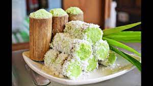 Made from rice flour and coloured green from pandan leaf, filled with palm sugar and steamed in a bamboo tube, the dish is served with.
